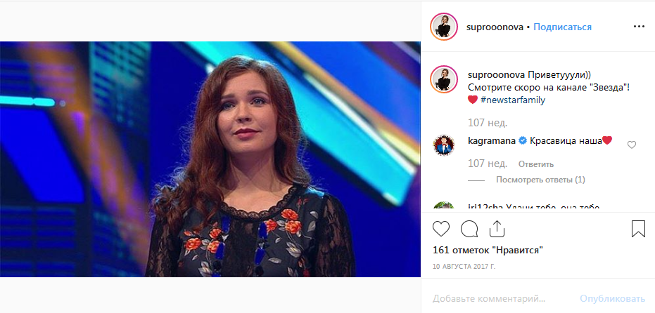 На передаче «Новая Звезда» Алисе Супроновой предстала в интересном амплуа и сразу запомнилась зрителям. Ее первый успех – участие в программе. Также свое мастерство она совершенствует в Академии искусств Санкт-Петербурга.
