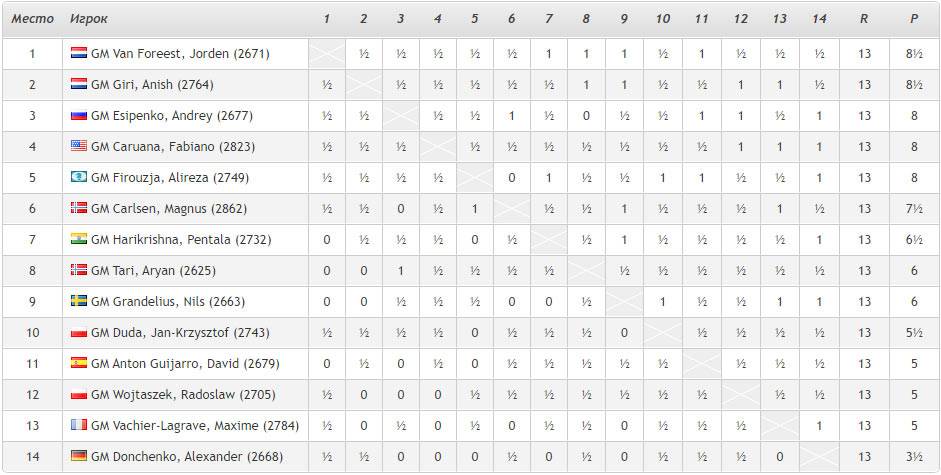 Итоговая турнирная таблица Tata Steel Masters 2020