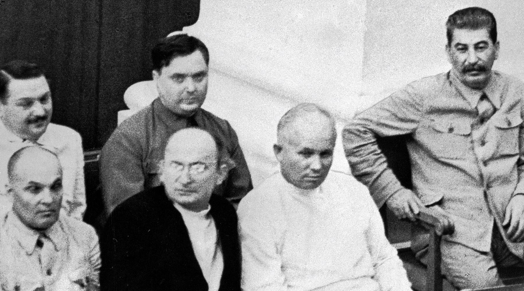 - Иосиф Сталин, Никита Хрущёв, Лаврентий Берия, Матвей Шкирятов (в первом ряду справа налево), Георгий Маленков и Андрей Жданов (во втором ряду справа налево)