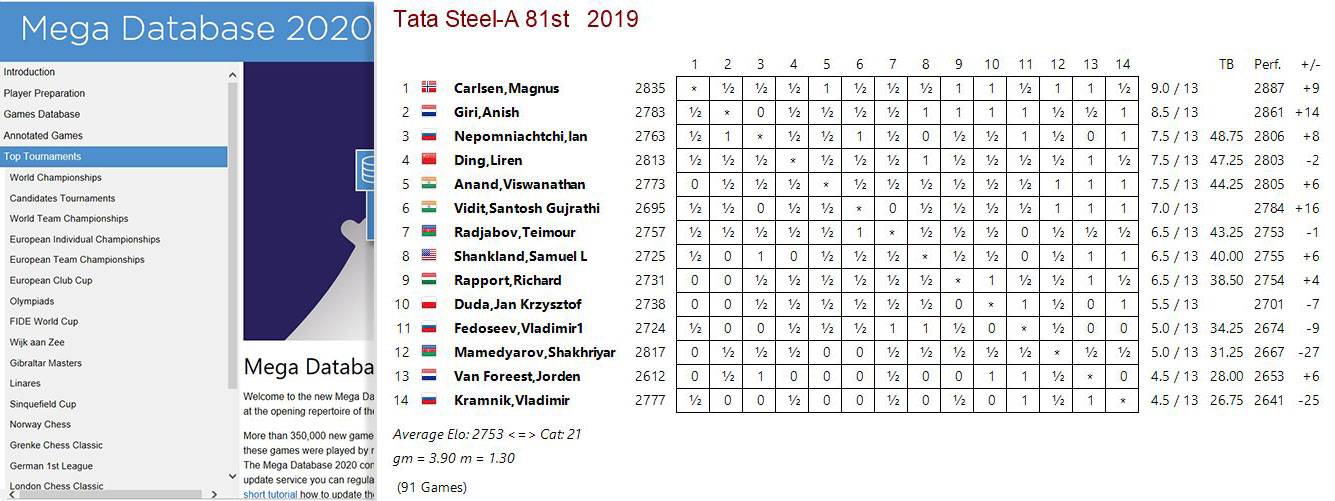 Tournament Tables to all Top-Tournaments, e.g. Tata Steel in Wijk aan Zee 2019: