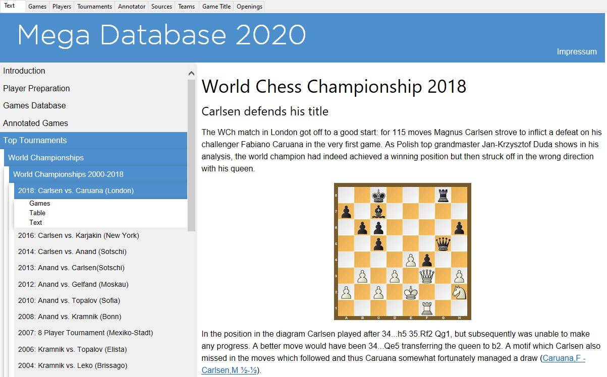 Navigating the database is easier than ever: a new menu makes it easy to prepare for your games, to search for tournaments, to find annotated games or to access all the games in the database. One improvement: all World Championship matches and a lot of top tournaments can be directly accessed via the menu — with tables, all games, and texts about the tournaments which give you additional information and insights.