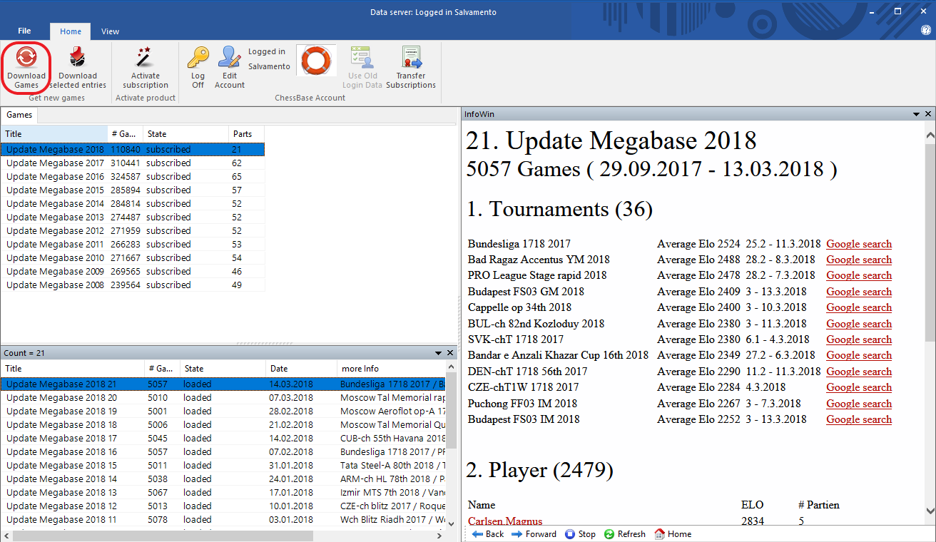 - Update service in combination with a ChessBase full version with about 250,000 new games until the end of 2021 (weekly updates with about 5,000 new games every week)