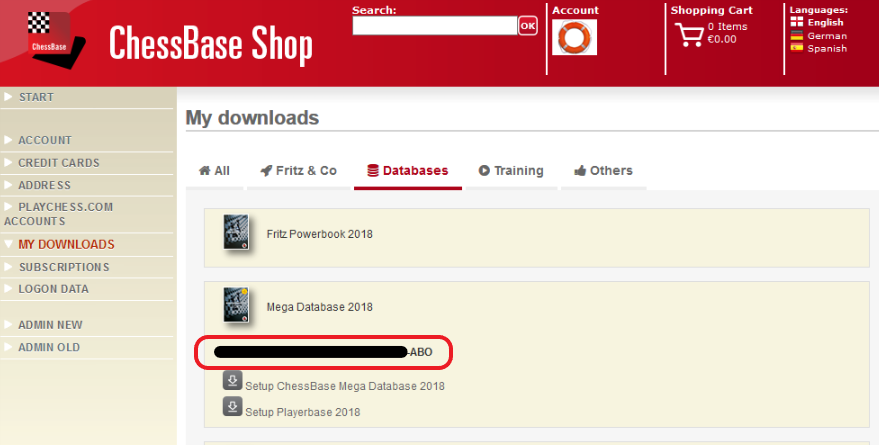 If you have purchased the database as a download in our shop, you will find the serial number in your shop account under “My Downloads” in the subcategory “Databases” (marked red in the picture below):