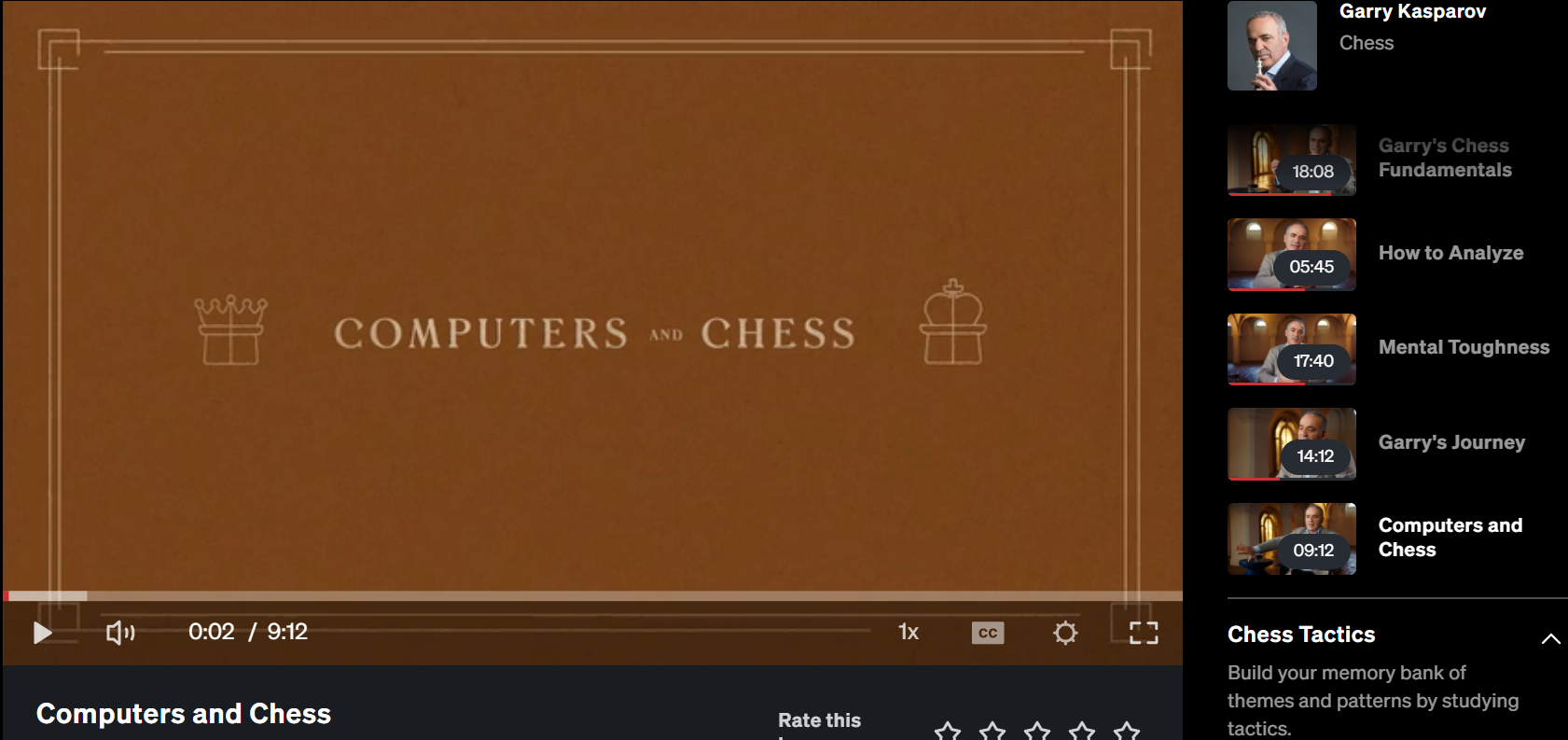 После короткого вводного видео следует 18-минутное видео об идеях высокого уровня, в котором Каспаров обсуждает разницу между тактикой и стратегией и важность повторения для распознавания образов. Шахматы действительно являются спортивным занятием столетней давности, которое вдохновило множество книг на теорию, лучшую игру, превосходства и худшие цвета шахмат