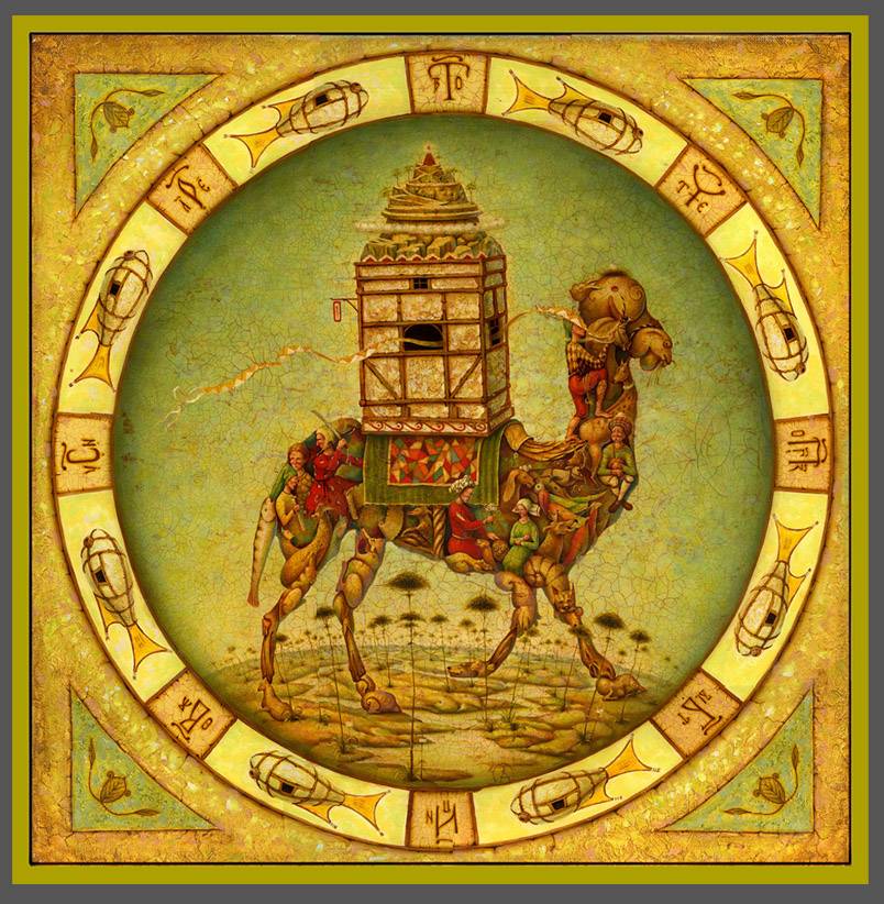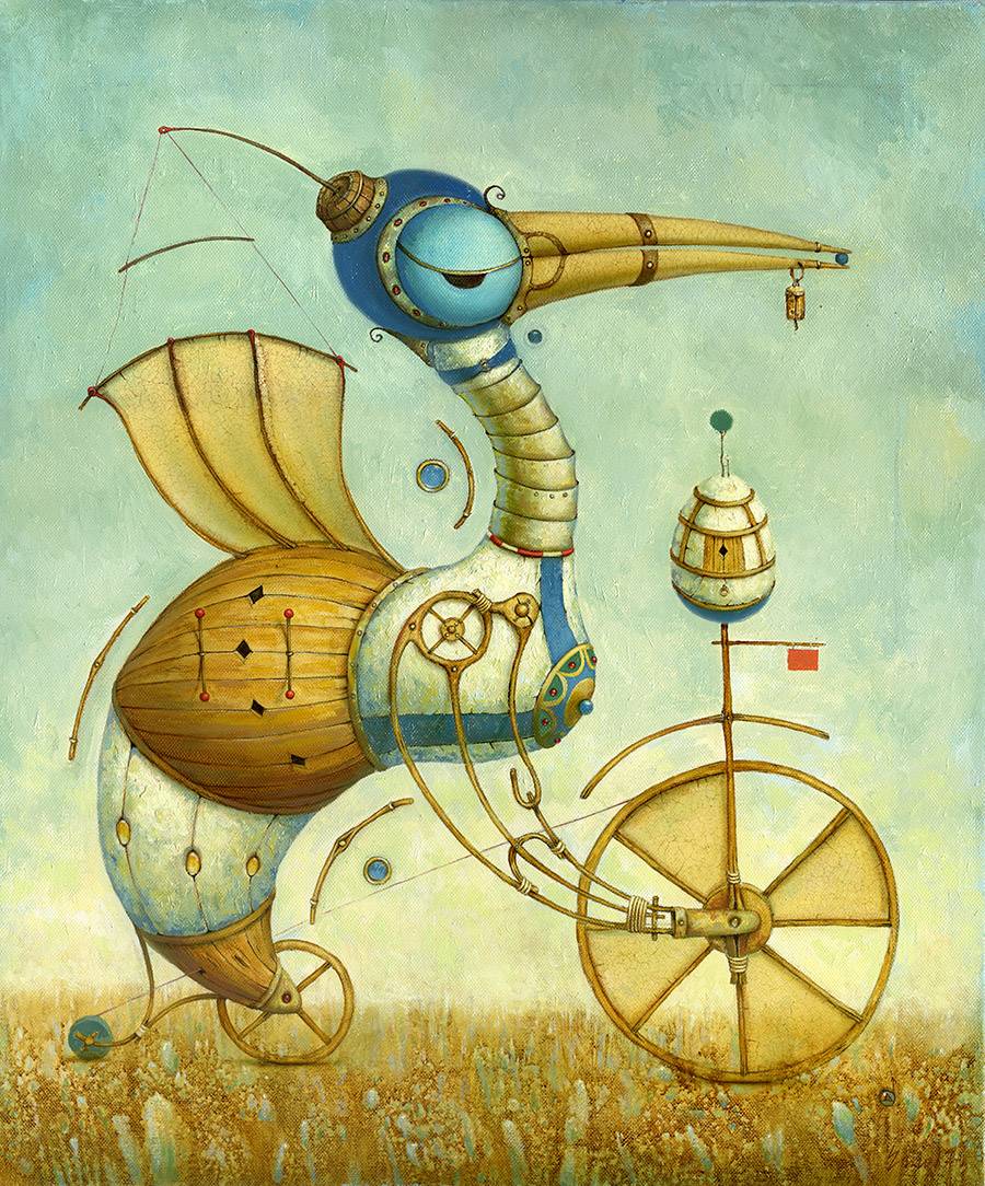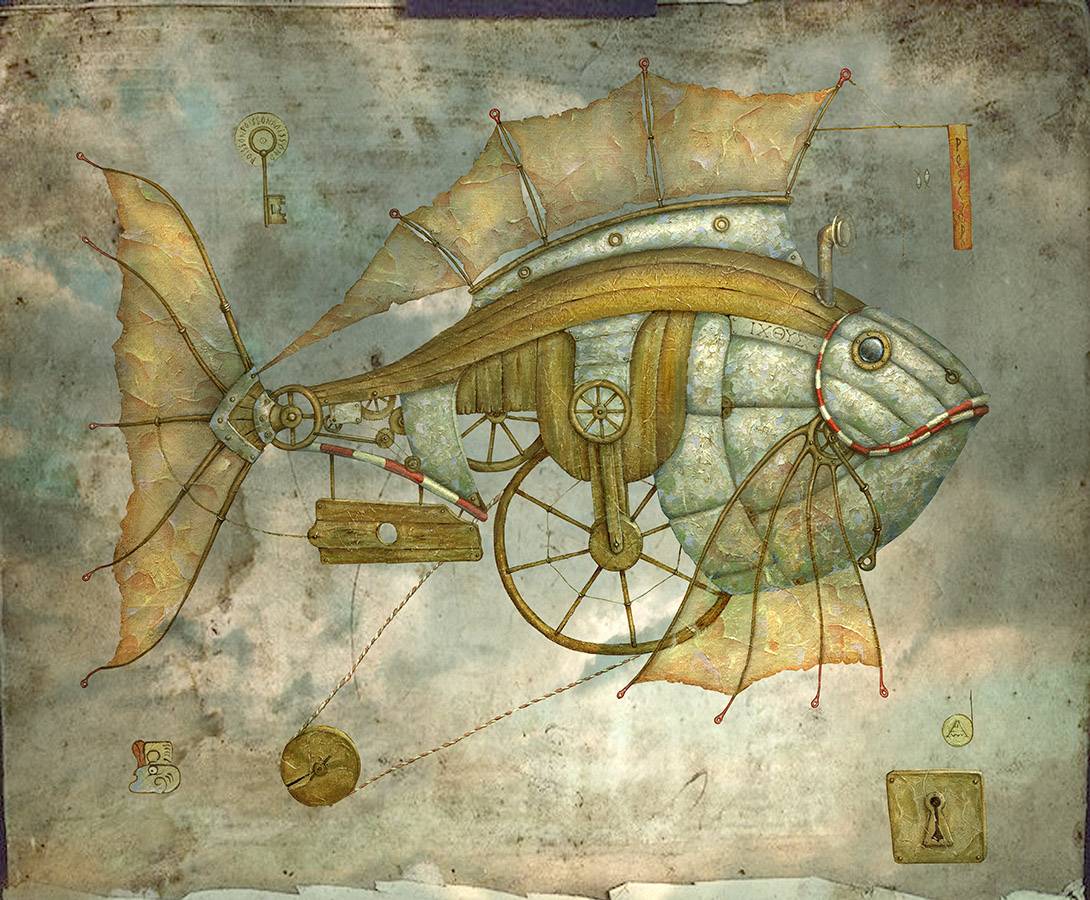 Такие же любимые мотивы есть и в картинах Алексея Ежова. Самые распространенные — это люди в средневековых одеждах, действительно будто сошедшие с картин Босха, а также странные полу-механические рыбы и животные. Механика вообще характерна для картин Алексея, но не стимпанковская, а скорее, опять таки, средневековая — какие-то странные паруса, деревянные колеса и механизмы.