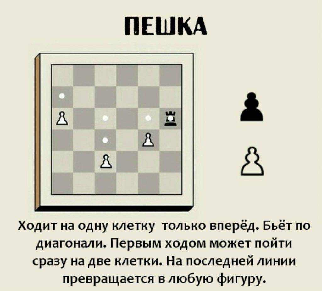 - Пешка — важная особенность шахматной пехоты в том, что пешки не могут ходить назад. Данная фигура идет по прямой на одно поле вперед. Первый ход является исключением, шахматист может выставить пешку сразу на два поля. Бьет данная фигура на одно поле диагонально в любую из сторон. И хоть пешка считается самой слабой на поле, она часто решает исход боя. Когда эта единица доходит до крайней линии доски, она может стать любой фигурой, за исключением короля. При этом замена статуса пешки считается ходом.