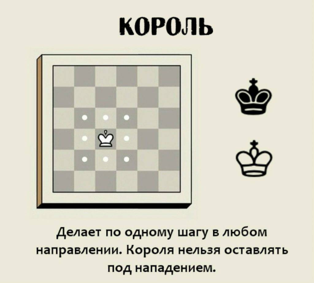 Это важнейшая фигура, вокруг которой и строится игра, а потому когда объявляется мат, игра завершается. Король не может ходить под бой и находиться под ним, он должен быть постоянно защищен. Его возможности в движении довольно ограничены: в любую сторону, но всего на одно поле. Когда количество фигур во время игры уменьшается, сила короля бывает соизмерима с другой легкой фигурой.