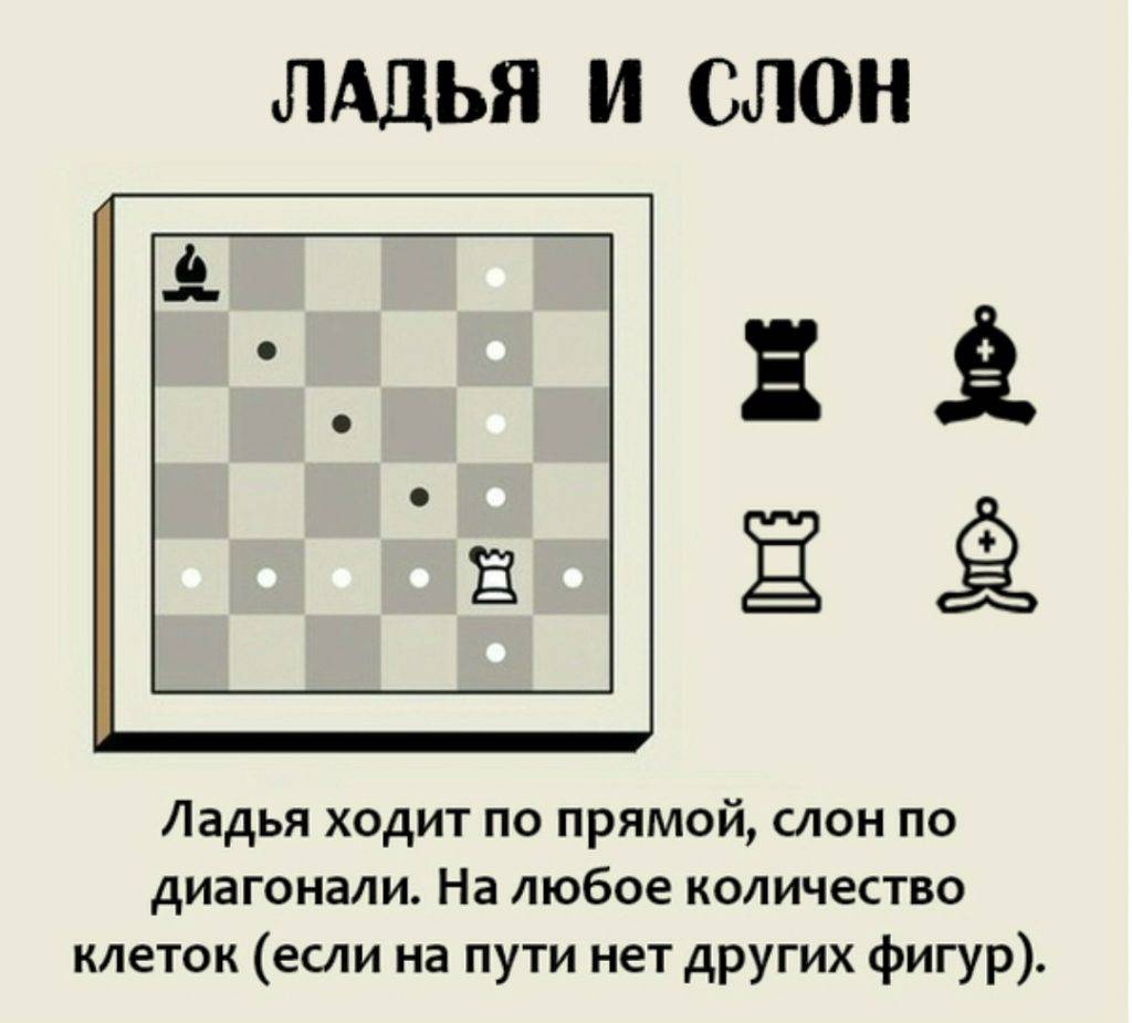 - Ладья — ходит строго по вертикали или горизонтали на сколько угодно клеток, атакует тоже по прямой. Может участвовать в рокировке, этот прием выполняется с целью переместить короля в более защищенное место. Для этого его перемещают на два поля в сторону ладьи, а она занимает место короля. Рокировка доступна только в том случае, если перечисленные фигуры еще не ходили, а на линии нет препятствий в виде других фигур. Проводить рокировку можно в любую сторону.