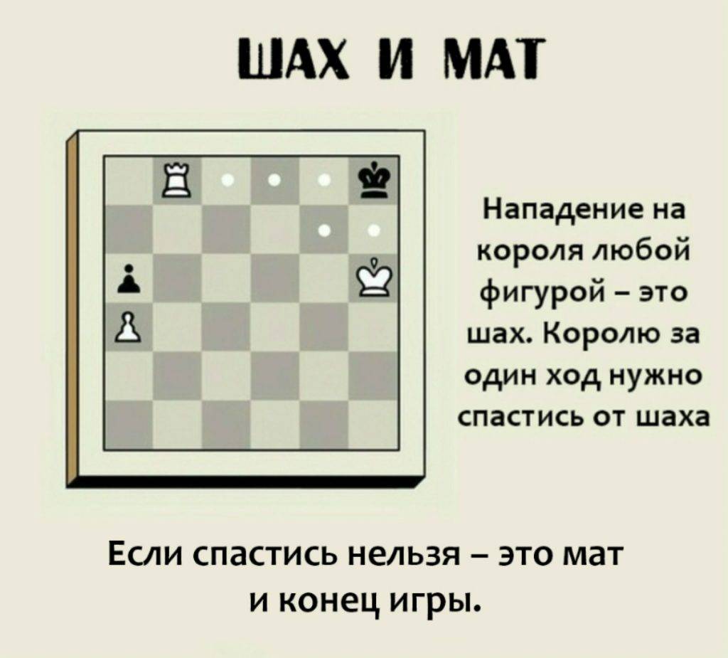 Цель игры – поставить мат королю соперника. Мат происходит, когда король попадает под шах и не может от него уйти. У короля есть всего три способа уйти от шаха: убежать на другую клетку (но только не посредством рокировки!), закрыться от шаха другой фигурой или взять фигуру, напавшую на короля. Если король не может избежать мата – игра завершена. Обычно короля не берут и не снимают с доски, игра просто объявляется законченной.