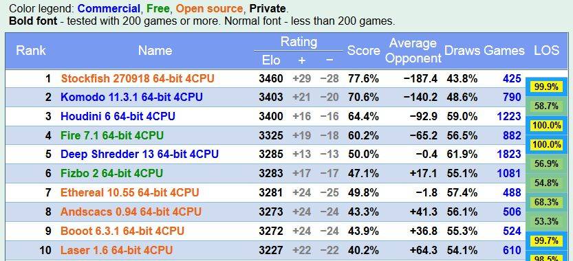 | 1 | Stockfish 10 | 3551 | 27653 | 86.76 | 74.49 | 24.50 | Romstad, Costalba, Kiiski, Linscott |