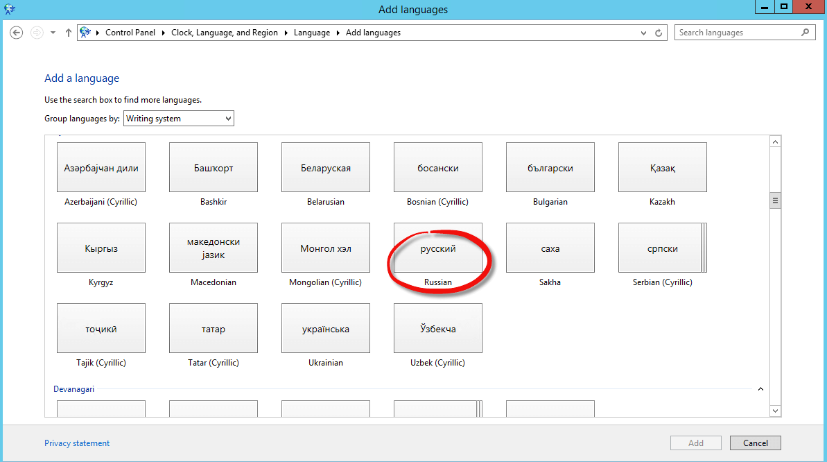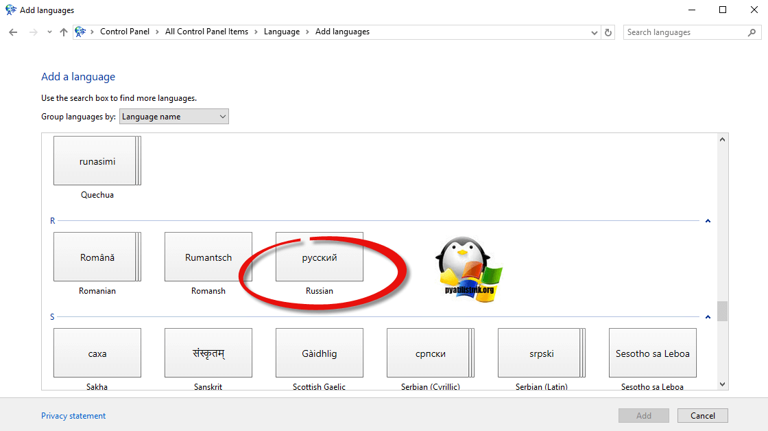 Нажмите кнопку «Добавить язык»и выберите нужный языковой пакет