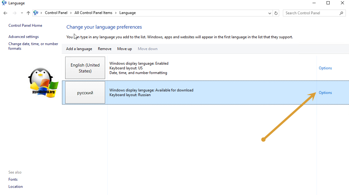 Теперь нужно применить наш language pack с русским языком, для того чтобы сменить интерфейс WIndows. Жмем Options