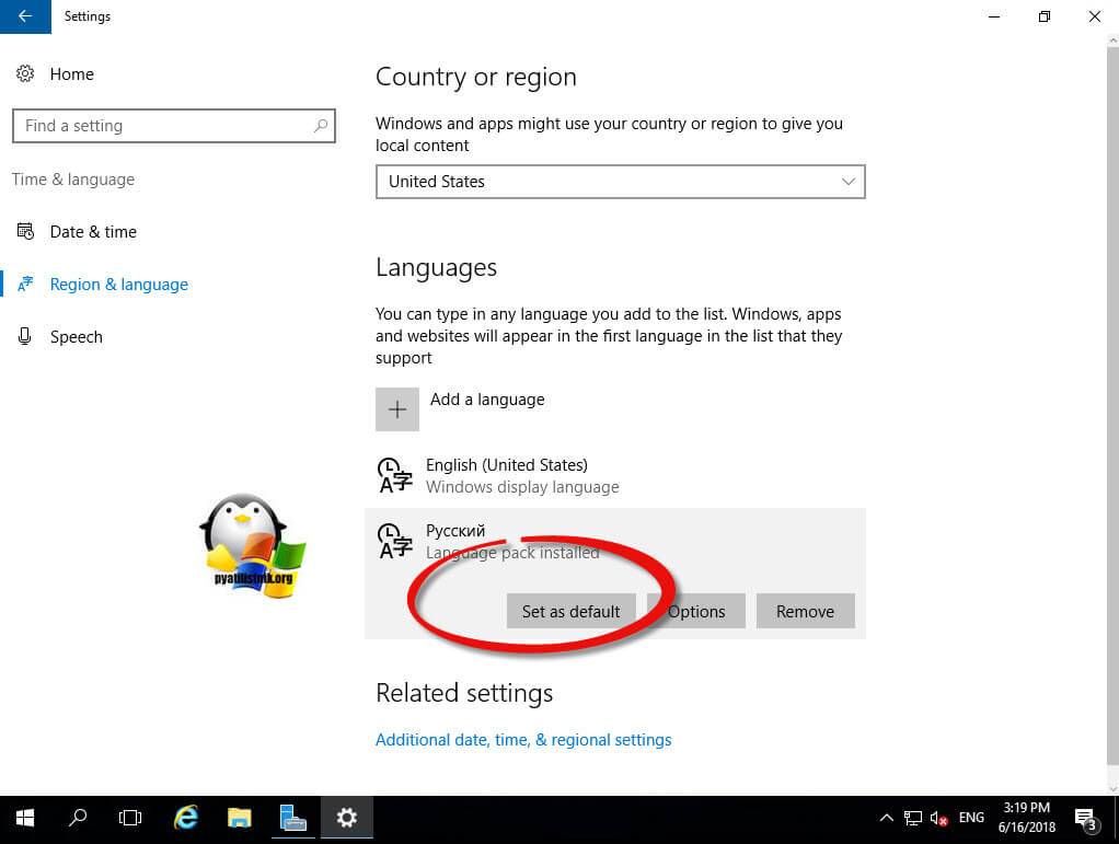 После окончания процесса установки ЯП снова зайдите в свойства языка и назначьте его основным языком системы.