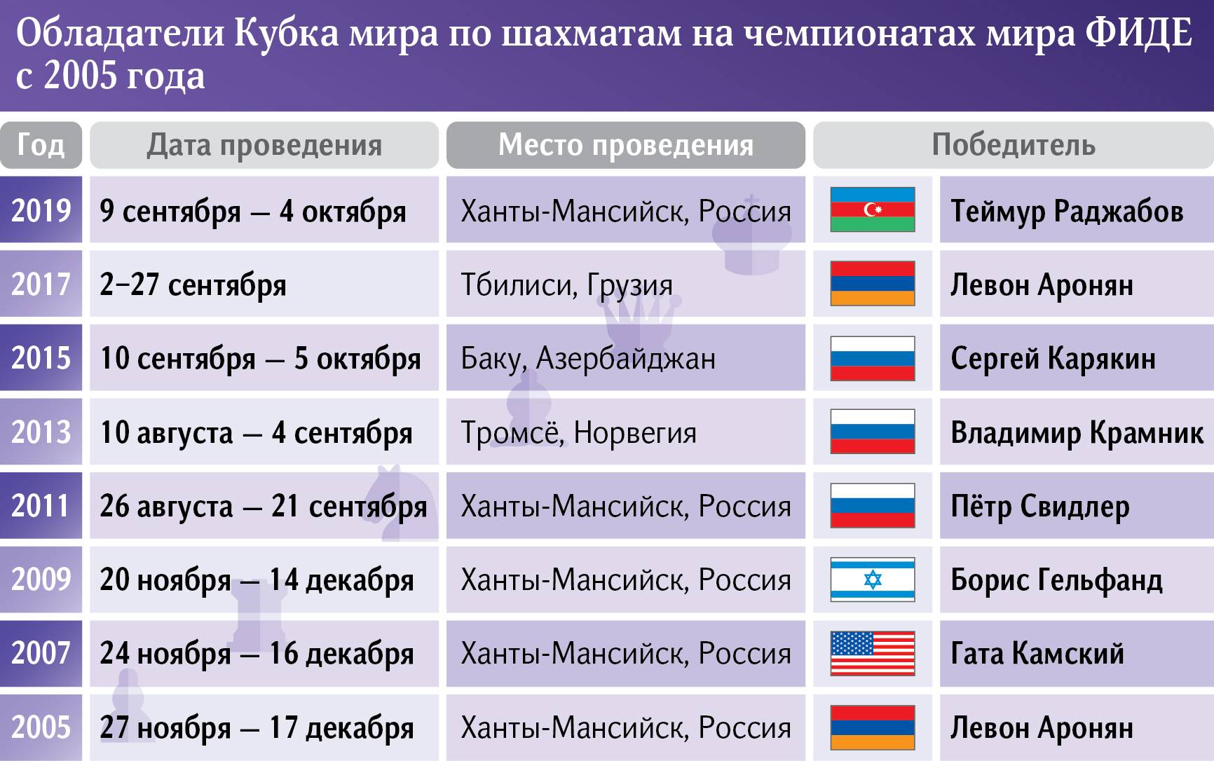 Победителем прошлого КМ стал азербайджанский гроссмейстер Теймур Раджабов. В финале он обыграл китайца Дин Лижэня (оба получили путевку в турнир претендентов – 2020, в этом году вновь будут разыграны места в главном шахматном турнире ФИДЕ следующего года). Женский КМ проводится впервые. Сразу три девушки получат место на турнире претендентов – 2022. Пока в топ-8 пробились только Александра Горячкина (как участник чемпионского матча), Екатерина Лагно и Хампи Конеру (заняли второе и третье места по итогам четырех этапов Гран-при ФИДЕ).