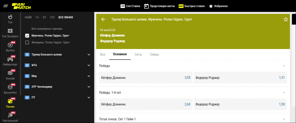 Ставки на исход всегда были популярными, в любой спортивной дисциплине, в том числе, и в теннисе. Новичков данный маркет привлекает легкостью прогнозирования, так как достаточно просто ставить на фаворитов, на которых букмекер часто предлагает заведомо неплохие котировки «1.4-1.5», чтобы добиться плюса на дистанции. Опытным бетторам даже удается найти валуи или недооцененных аутсайдеров в линии, благодаря чему они могут заключать пари с завышенными коэффициентами.