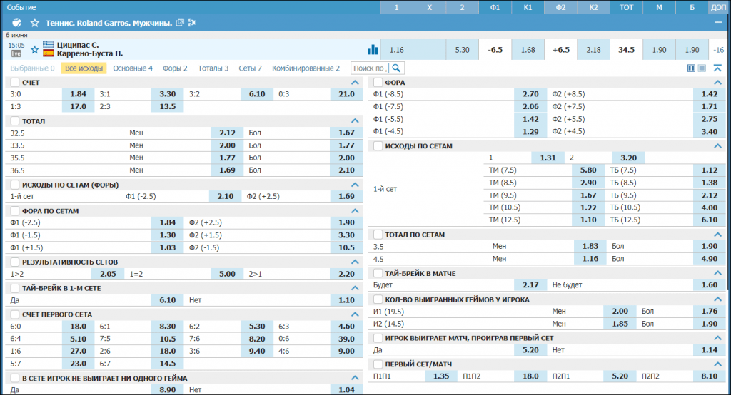 Роспись на теннисный матч на примере встречи Циципаса и Коррено.